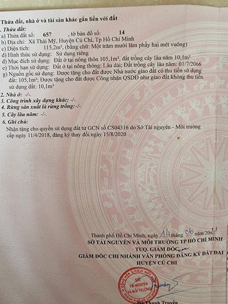 BÁN ĐẤT CẠNH ĐƯỜNG TỈNH LỘ 7, XÃ THÁI MỸ, HUYỆN CỦ CHI TP HCM