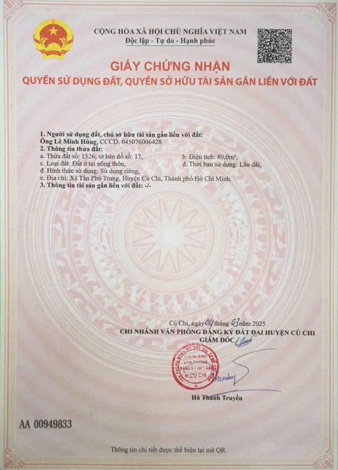 Bán đất MT đường Cây Da, Tân Phú Trung Củ Chi, dt 80m2, full thổ cư, giá 2,5 tỷ