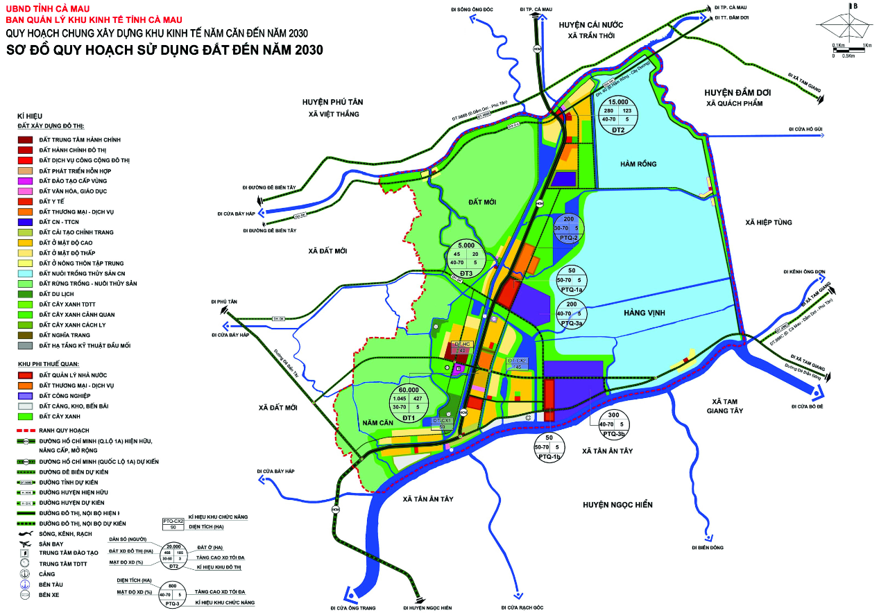 Cụ thể. bản đồ quy hoạch Khu kinh tế Năm Căn Cà Mau và chỉ tiêu sử dụng 10.801,95ha tổng diện tích đất tự nhiên giai đoạn đến năm 2030