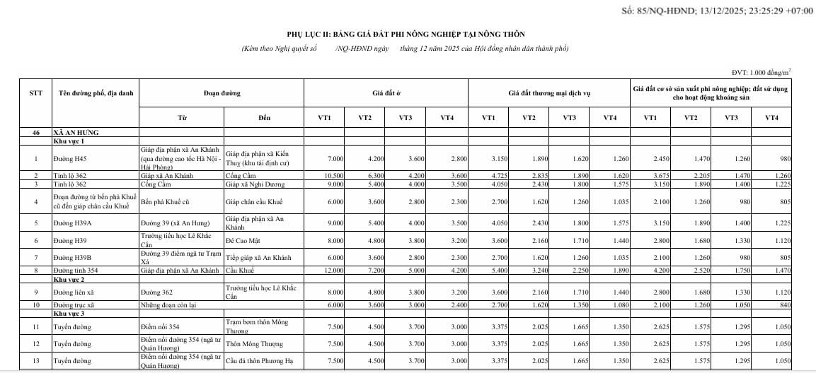 Ngày 11/12/2025, Hội đồng nhân dân TP Hải Phòng đã có Nghị quyết 85/NQ-HĐND năm 2025 về việc ban hành Bảng giá đất lần đầu trên địa bàn thành phố.