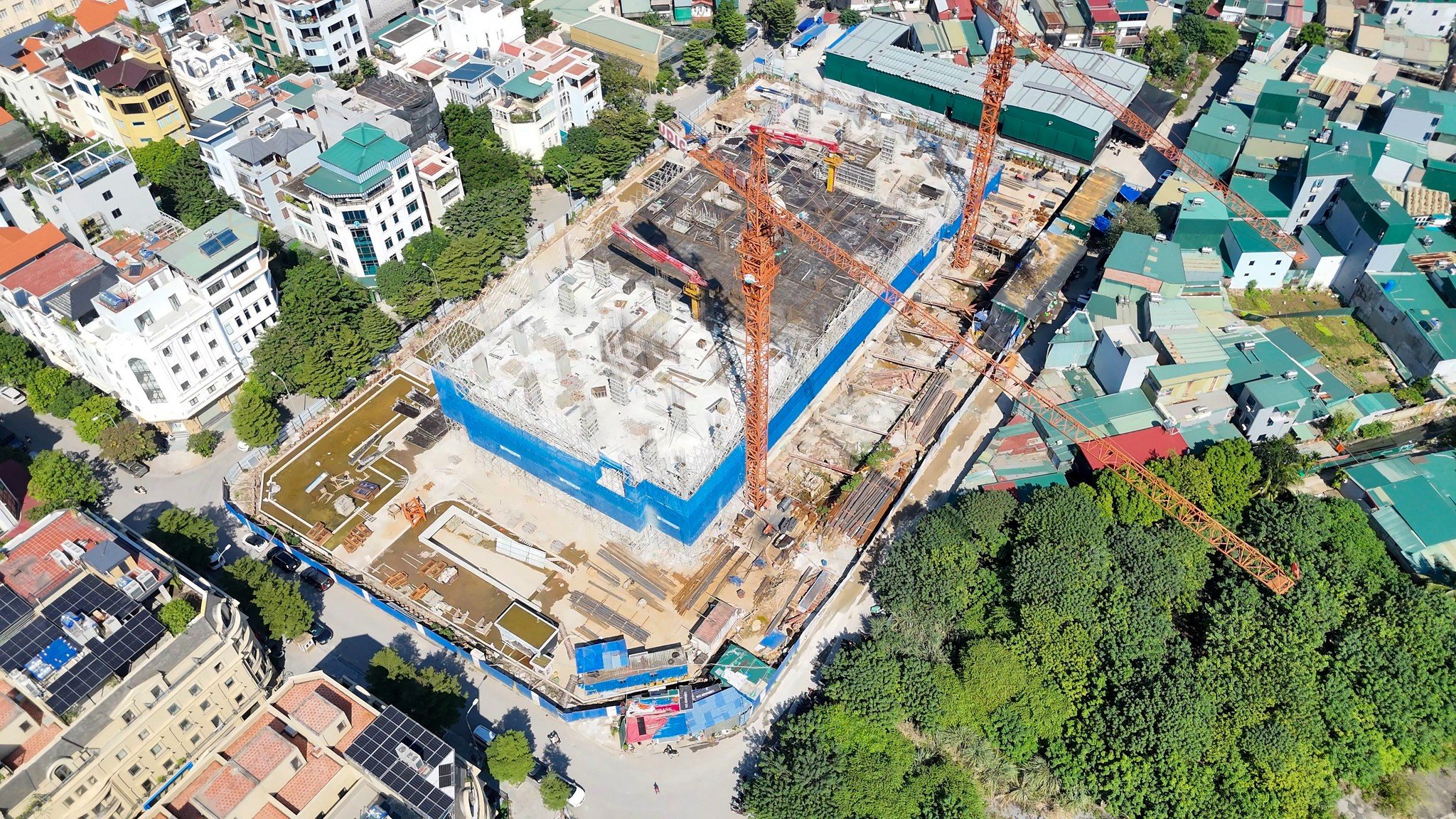Công trình đang ở giai đoạn thi công kết cấu phần thân. Mặt bằng công trường lớn, bố trí nhiều khu vực thi công song song, cho thấy tiến độ được đẩy nhanh.
