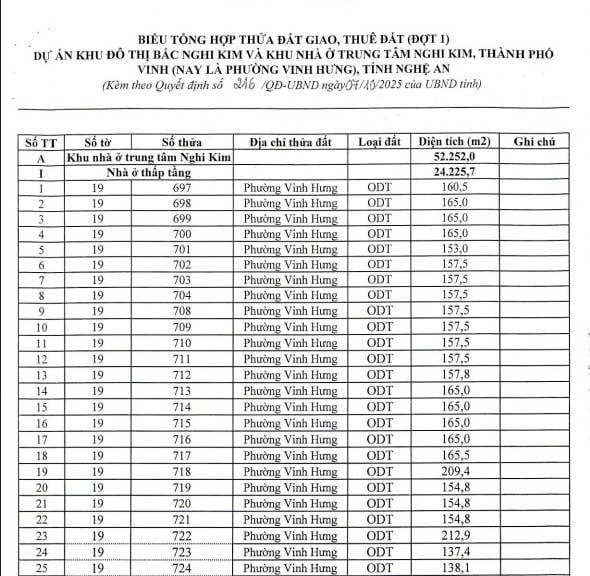 Dưới đây là tổng hợp thửa đất giao, thuê đất làm dự án Khu đô thị Bắc Nghi Kim và Khu nhà ở Trung tâm Nghi Kim (đợt 1) phường Vinh Hưng Nghệ An: