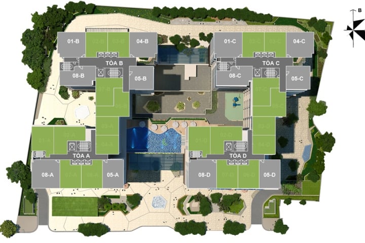 (2) Tòa B gồm 3 khối nhà B1, B2 và B3. Khối nhà B1: 26 tầng, B2: 29 tầng, B3: 27 tầng