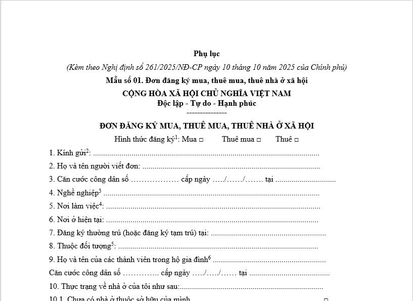 Mẫu đơn đăng ký thuê nhà ở xã hội HCM mới nhất theo Nghị định 261/2025 là Mẫu số 01 ban hành kèm theo Nghị định 261/2025/NĐ-CP áp dụng từ ngày 10/10/2025.