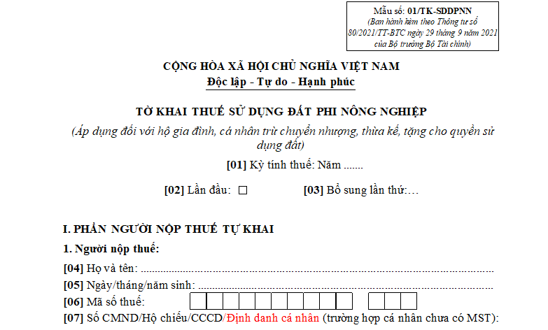 [1] Tờ khai thuế sử dụng đất phi nông nghiệp (áp dụng đối với hộ gia đình, cá nhân trừ chuyển nhượng, thừa kế, tặng cho quyền sử dụng đất) là mẫu số 01/TK-SDDPNN ban hành kèm theo Thông tư 80/2021/TT-BTC.