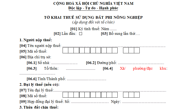 Tải về Tờ khai thuế sử dụng đất phi nông nghiệp (áp dụng đối với tổ chức): TẠI ĐÂY