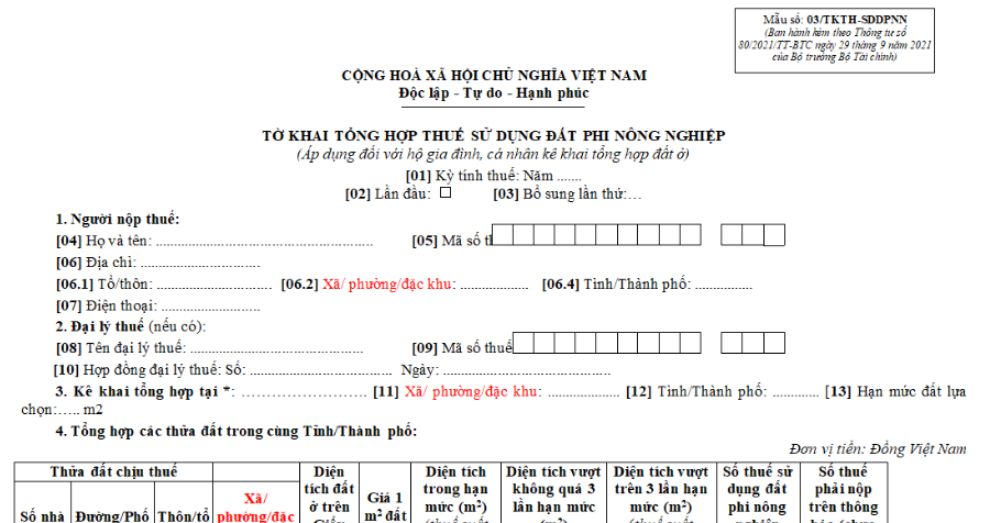 [3] Tờ khai tổng hợp thuế sử dụng đất phi nông nghiệp (áp dụng đối với hộ gia đình, cá nhân kê khai tổng hợp đất ở) là mẫu số 03/TKTH-SDDPNN ban hành kèm theo Thông tư 80/2021/TT-BTC.