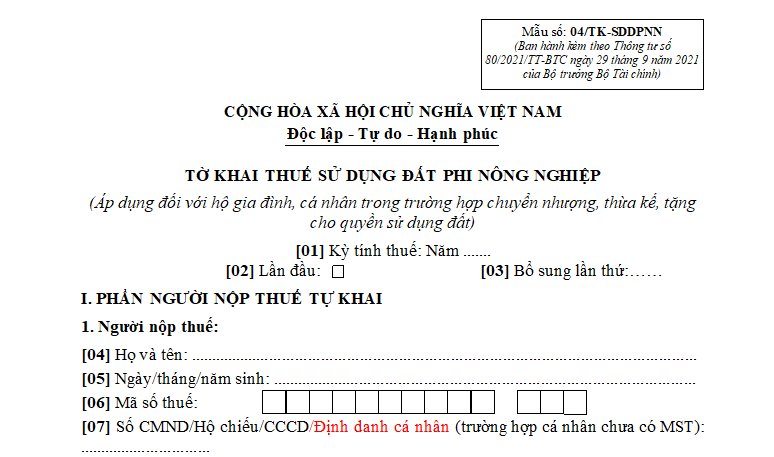 [4] Tờ khai thuế sử dụng đất phi nông nghiệp (áp dụng đối với hộ gia đình, cá nhân trong trường hợp chuyển nhượng, thừa kế, tặng cho quyền sử dụng đất) là mẫu số 04/TK-SDDPNN ban hành kèm theo Thông tư 80/2021/TT-BTC.