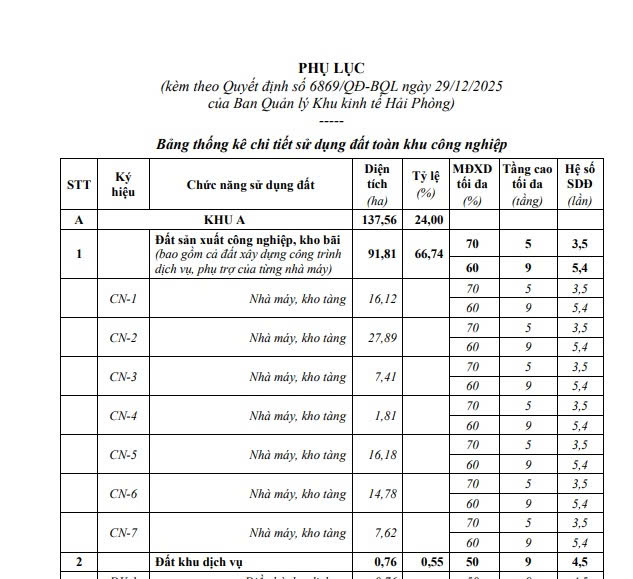 Quy hoạch chi tiết sử dụng đất khu công nghiệp Tiên Lãng 1 Hải Phòng được nêu tại Phụ lục ban hành kèm theo Quyết định 6869/QĐ-BQL năm 2025:
