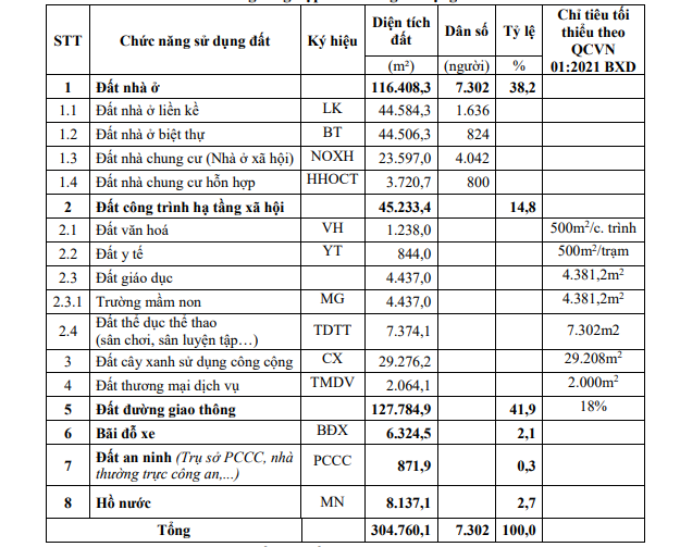 Trên đây là bảng tổng hợp chức năng sử dụng đất khu đô thị mới tại phường Hương Mạc,Từ Sơn