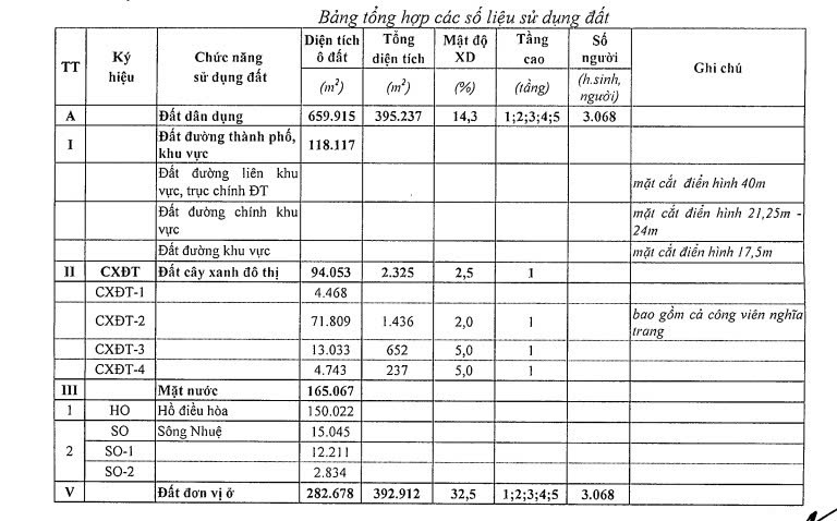 - Đất mặt nước (ký hiệu HO, SO): có tổng diện tích 165.067 m, trong đó: hồ điều hòa (ký hiệu HO) có diện tích 150.022 m’; sông Nhuệ (gồm 02 lô đất ký hiệu SO- 1, SO-2) có diện tích 15.045 m2.