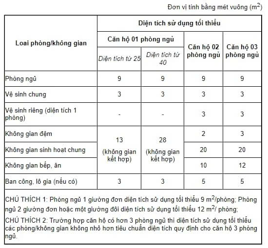 - Diện tích sử dụng tối thiểu các phòng/không gian của căn hộ lưu trú như sau: