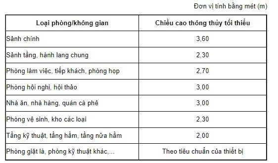 - Chiều cao thông thủy tối thiểu của các phòng/không gian khối dịch vụ, khối hành chính quản trị và khối kỹ thuật - phụ trợ như sau:
