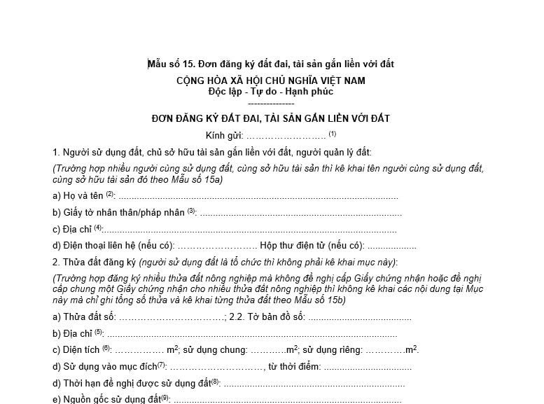 Dưới đây là hướng dẫn viết đơn đăng ký đất đai, tài sản gắn liền với đất theo mẫu số 15 tại Nghị định 151/2025/NĐ-CP, cụ thể như sau: