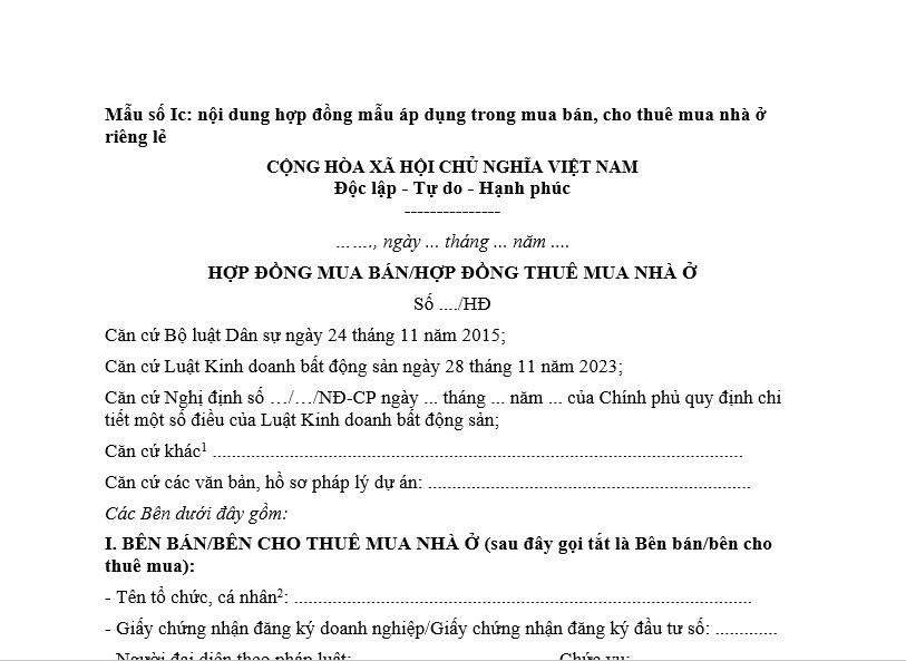 Mẫu hợp đồng mua bán nhà ở năm 2025 là Mẫu số Ic Phụ lục I ban hành kèm theo Nghị định 96/2024/NĐ-CP theo mẫu dưới dây: