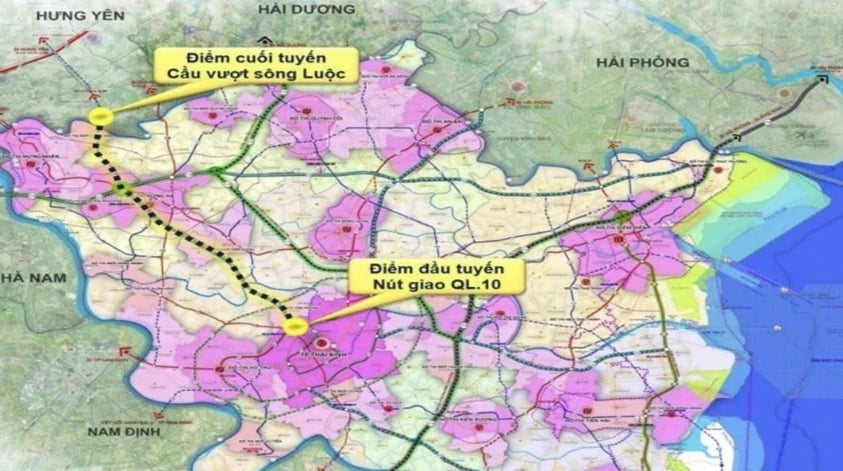 Bản đồ tuyến đường nối từ phường Thái Bình với trung tâm tỉnh Hưng Yên thể hiện rõ điểm đầu tại nút giao giữa đường vào Khu công nghiệp TBS Sông Trà với Quốc lộ 10 và điểm cuối tại đầu cầu vượt sông Luộc.