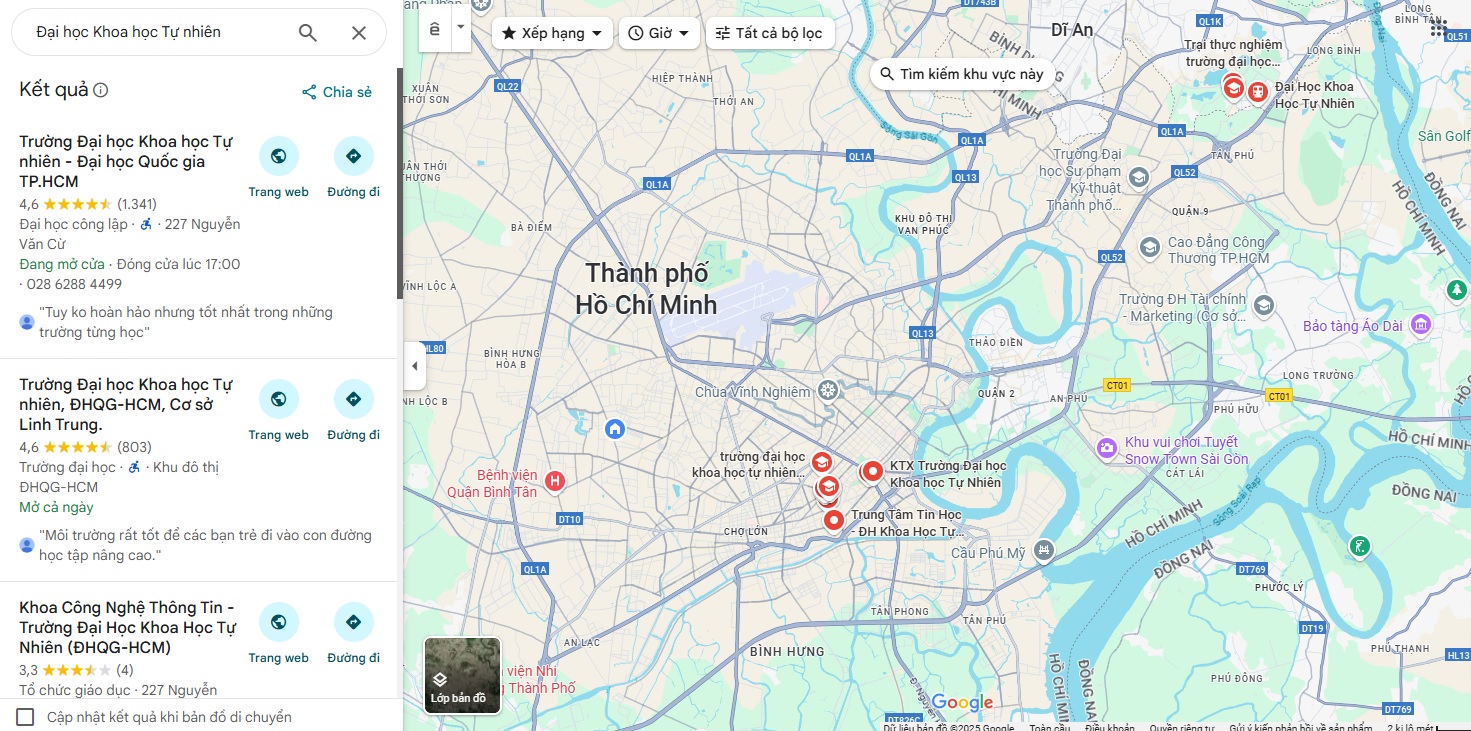 Trường Đại học Khoa học Tự nhiên TP.HCM hiện có hai cơ sở đào tạo chính. Cơ sở 1 tọa lạc tại số 227 Nguyễn Văn Cừ, Quận 5, thường là nơi học tập của sinh viên năm 3, năm 4 và các chương trình sau đại học.
