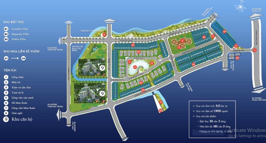 Giai đoạn 1: Nhà liên kế: 185 căn, diện tích 5x20m, Biệt thự vườn: 30 căn, diện tích 12x20m