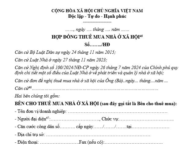Mẫu hợp đồng cho thuê mua nhà ở xã hội Thới Bình mới nhất năm 2025 như sau: