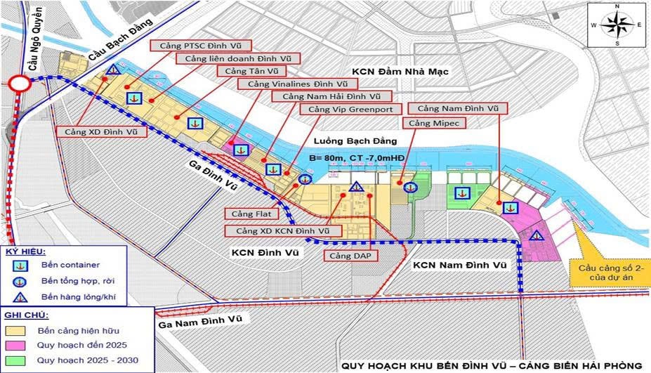 Căn cứ theo tiểu mục 1.1.4 Mục 1.1 Chương 1 Báo cáo đánh giá tác động môi trường “Dự án đầu tư xây dựng cầu cảng số 2 thuộc Bến cảng dầu Nam Đình Vũ” (trang 49), bản đồ vị trí dự án cầu cảng số 2 thuộc Bến cảng dầu Nam Đình Vũ tại Hải Phòng cụ thể như sau: