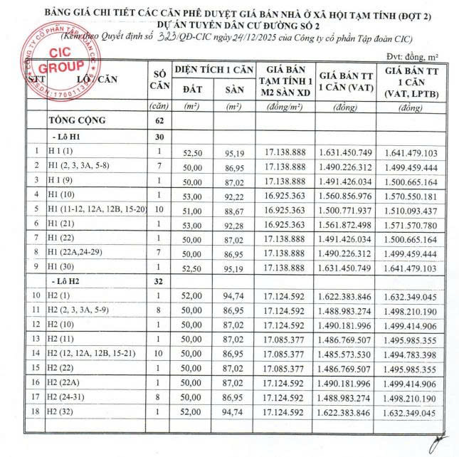 Chi tiết giá bán nhà ở xã hội CIC Boulevard tại An Giang (Đợt 2) được nêu tại Quyết định 323/QĐ-CIC 2025, cụ thể như sau: