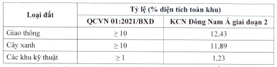 Từ bảng trên cho thấy chỉ tiêu sử dụng đất của Khu công nghiệp Đông Nam Á giai đoạn 2 hoàn toàn phù hợp với chỉ tiêu quy định tại QCVN 01:2021/BXD.