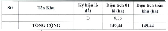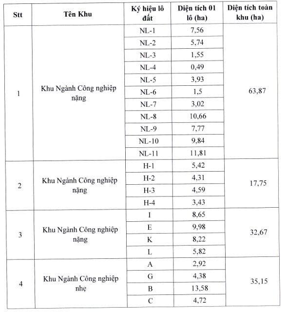 Bảng thống kê lô đất công nghiệp