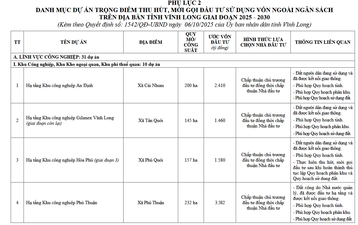 Trên đây là thông tin về "Danh mục 78 dự án trọng điểm mời gọi đầu tư tại Vĩnh Long giai đoạn 2025 2030 (Quyết định 1542/QĐ-UBND)"