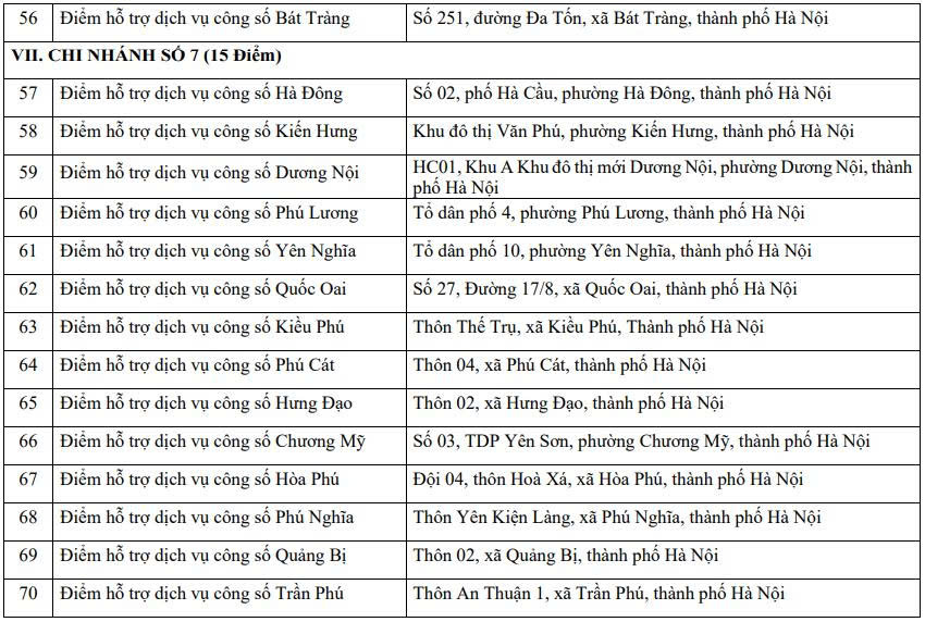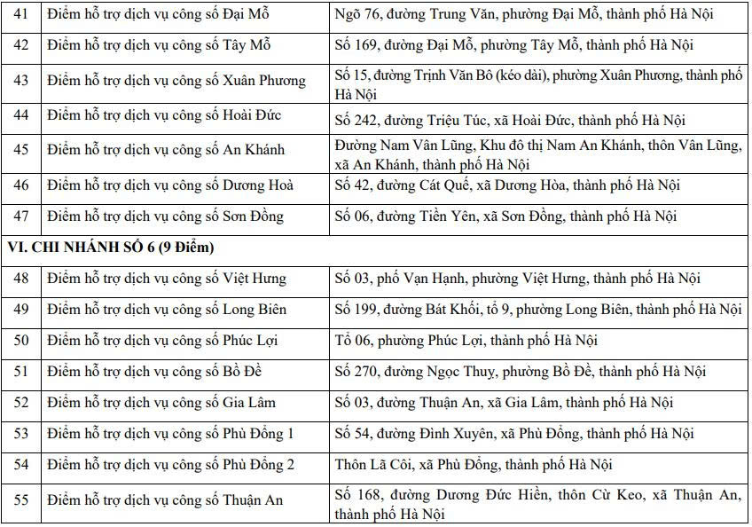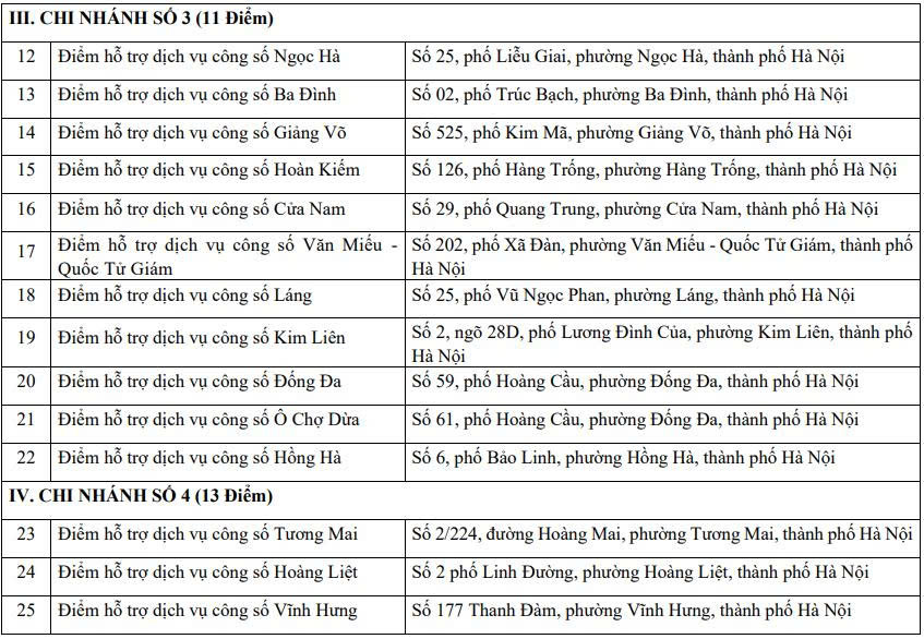 Địa chỉ 139 điểm hỗ trợ dịch vụ công số Trung tâm hành chính công Hà Nội