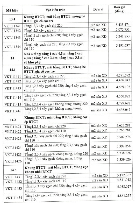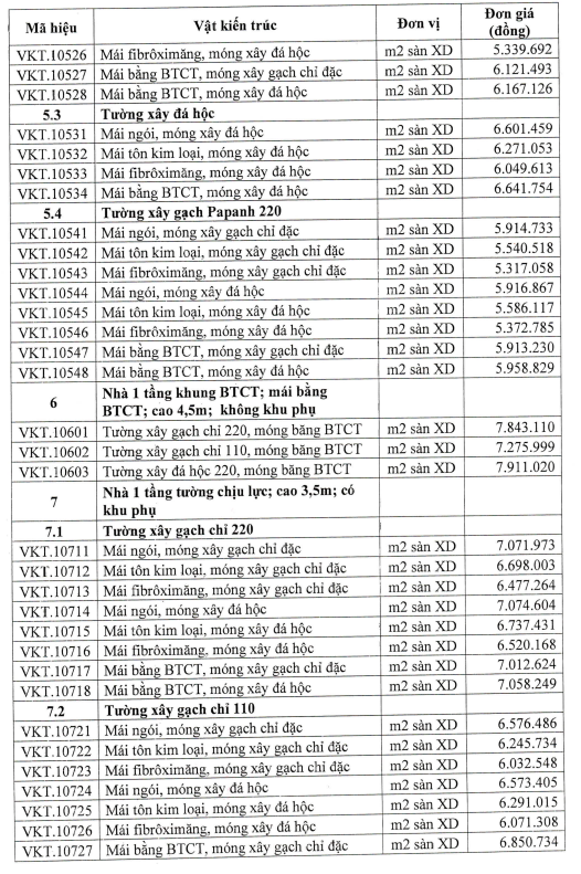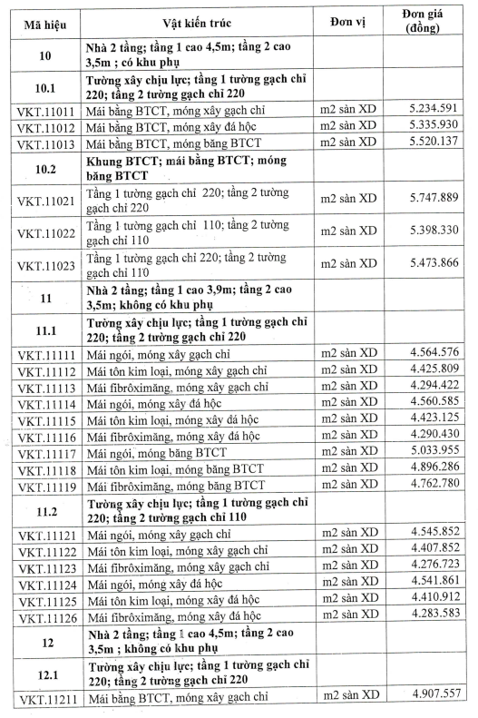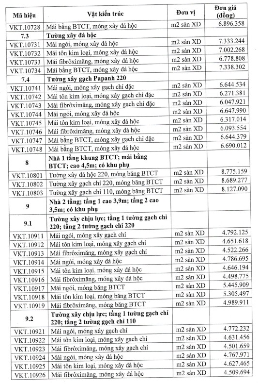 Các đơn giá có mã hiệu từ VKT.10101 đến VKT.11527 chưa bao gồm: Cửa các loại; Lan can, tay vịn cầu thang, ban công, lô gia; Ốp tường, cột, trụ; Lát nền nhà, cầu thang, tam cấp, khu nhà vệ sinh, bệ bếp,..; Trần chống nóng và trang trí các loại; Sơn, bả tường, trần...; Các thiết bị: Thang máy, Điều hòa, Điện thoại, Internet; Camera; Truyền hình, Quạt trần, Đèn chùm, Đèn trang trí, Bệ xí, Tiểu treo, Bồn tắm, Lavabo, Bình nóng lạnh, Tủ bếp,...; Bể chứa nước ăn, sinh hoạt; Các chi tiết phù điêu, phào chỉ và các chi tiết trang tríđặc biệt khác của công trình.
