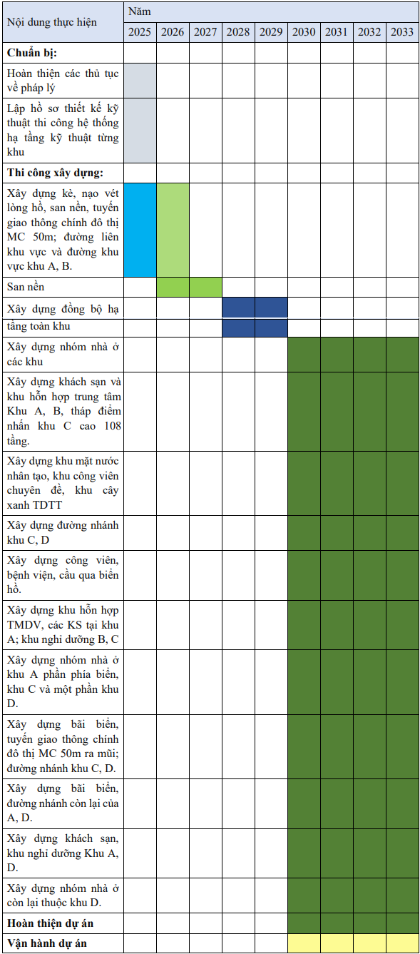 Căn cứ theo Mục 1.6.1 Chương 1 (trang 181) Báo cáo đánh giá tác động môi trường dự án khu đô thị du lịch lấn biển Cần Giờ nêu cụ thể về tiến độ xây dựng Dự án Khu đô thị du lịch lấn biển Cần Giờ Vinhomes Green Paradise dự kiến từ tháng 4/2025 đến năm 2030.