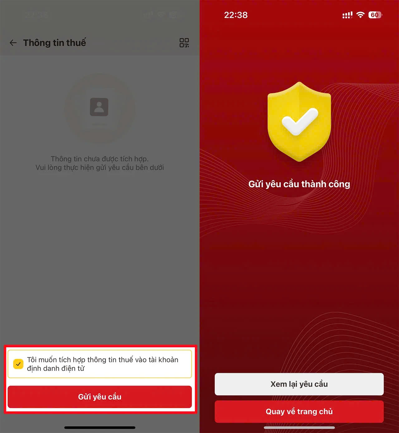 Bước 3: Tích chọn vào ô xác nhận “Tôi muốn tích hợp thông tin thuế vào tài khoản định danh điện tử” và nhấn Gửi yêu cầu
