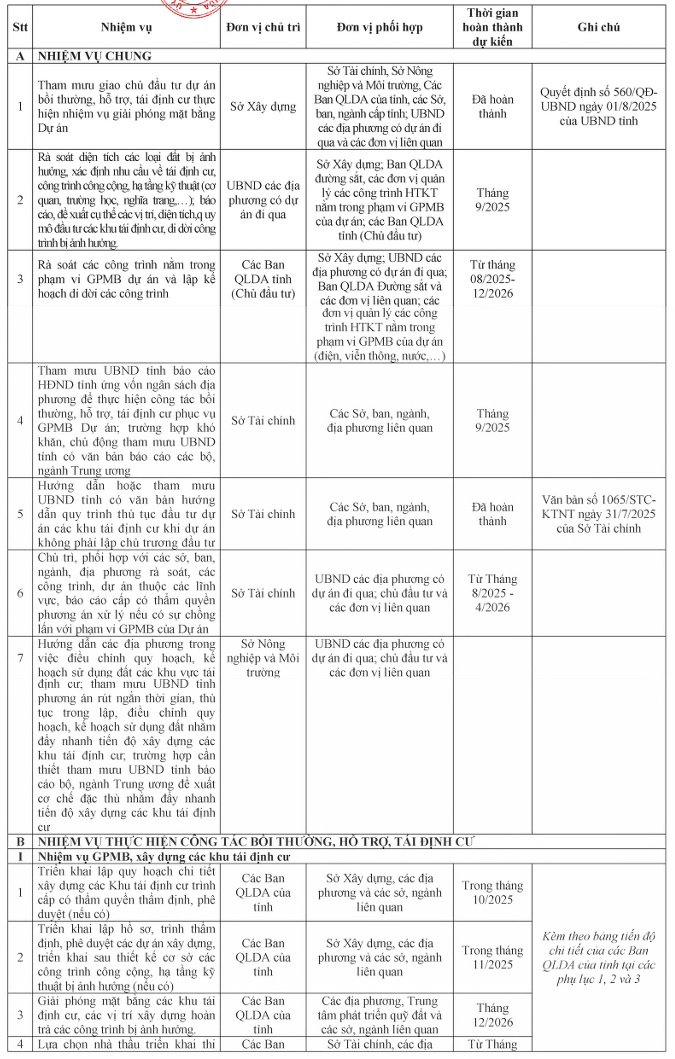 - Huy động toàn bộ hệ thống chính trị vào cuộc với sự đồng lòng và quyết tâm cao, phát huy mọi nguồn lực của tỉnh và các địa phương để thực hiện đảm bảo các mốc tiến độ chính đối với công tác giải phóng mặt bằng theo Nghị quyết 106/NQ-CP ngày 23/4/2025 của Chính phủ. Các mốc chính giải phóng mặt bằng như sau: