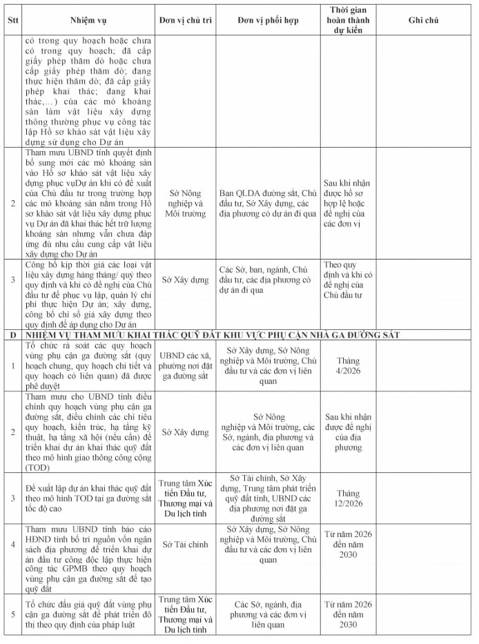 + Rà soát, điều chỉnh quy hoạch vùng phụ cận ga đường sắt, điều chỉnh các chỉ tiêu quy hoạch, kiến trúc, hạ tầng kỹ thuật để triển khai dự án khai thác quỹ đất theo mô hình TOD; hoàn thành phê duyệt dự án Khai thác quỹ đất theo mô hình TOD tại các ga đường sắt tốc độ cao trong tháng 12 năm 2026; Tổ chức đấu giá quỹ đất vùng phụ cận ga đường sắt để phát triển đô thị theo quy định của pháp luật từ năm 2027 đến năm 2030;