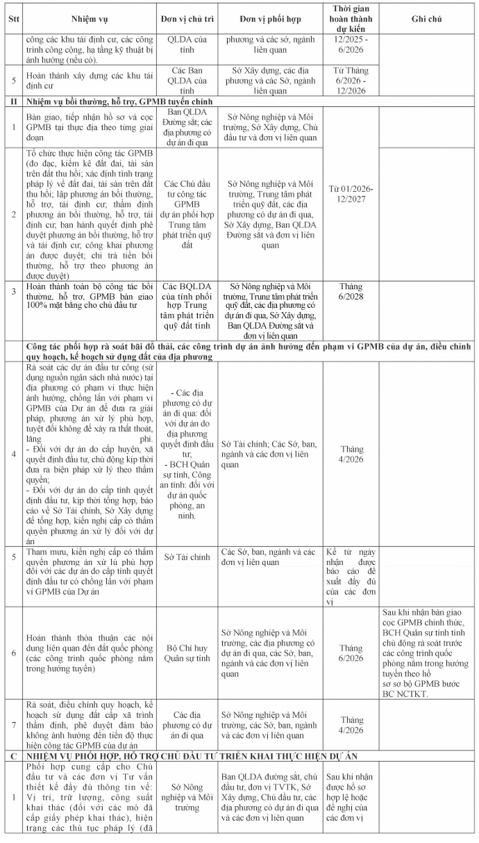 - Tổ chức thực hiện kịp thời, đầy đủ các nhiệm vụ thuộc trách nhiệm, thẩm quyền của Tỉnh đã được giao tại Nghị quyết 172/2024/QH15 ngày 30/11/2024 của Quốc hội, Nghị quyết 106/NQ-CP ngày 23/4/2025 của Chính phủ, các Kết luận của Ban Chỉ đạo Trung ương, Ban Chỉ đạo cấp tỉnh nhằm sớm oàn thành công tác giải phóng mặt bằng, bàn giao cho Chủ đầu tư;