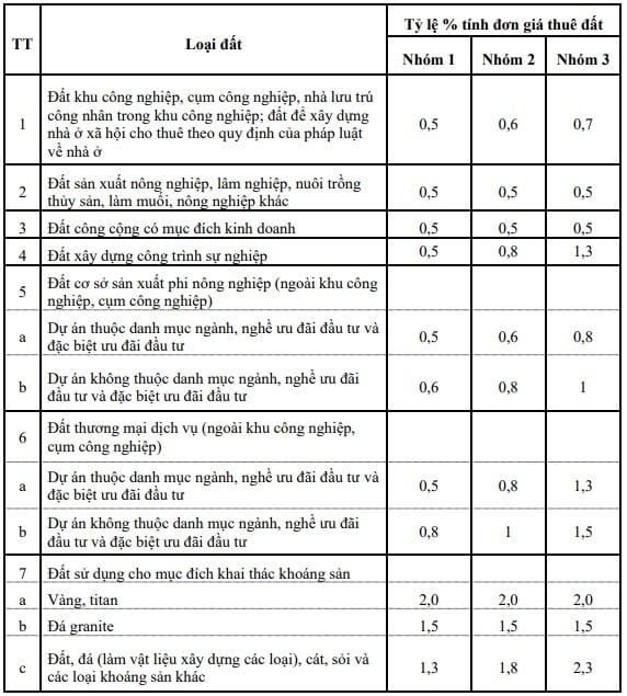 Bảng mức tỷ lệ phần trăm (%) tính đơn giá thuê đất hàng năm