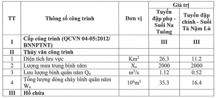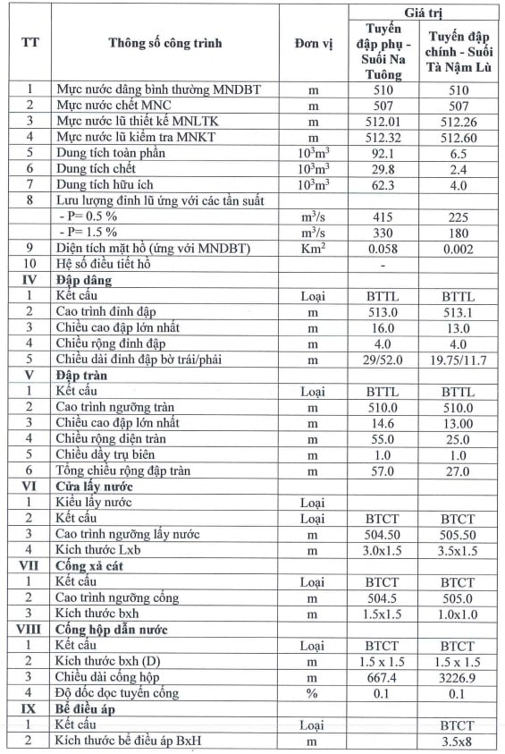- Tuyến đập chính suối Tà Nậm Lù gồm: Đập không tràn kết cấu bê tông trọng lực; Đập tràn tự do; Cống xả cát và Cửa lấy nước, hồ chứa dung tích 6.500 m³.