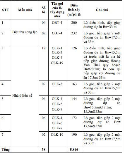 Dưới đây là chi tiết 38 căn nhà ở hình thành trong tương lai đủ điều kiện được bán cho thuê của Dự án Khu dân cư đô thị mới phía Bắc đường Hoàng Văn Thái, Khe Chít: