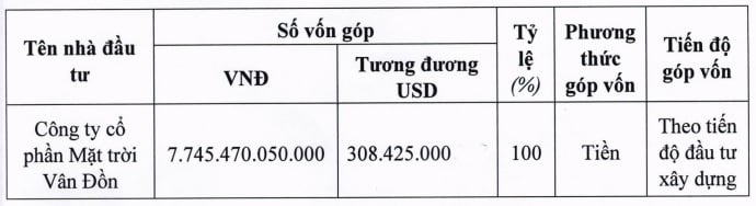 - Vốn góp của Nhà đầu tư: 7.745.470.050.000 (Bảy nghìn bảy trăm bốn mươi lăm tỷ, bốn trăm bảy mươi triệu, không trăm năm mươi nghìn) đồng và tương đương 308,425 triệu đô la Mỹ, chiếm tỷ lệ 15% vốn đầu tư dự án.