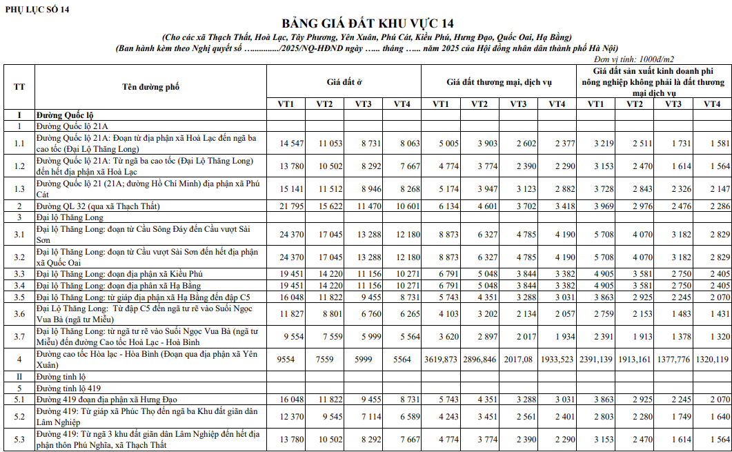 Theo đó, bảng giá đất Quốc Oai Hà Nội nằm ở khu vực 14 ban hành kèm theo Nghị quyết 52/2025/NQ-HĐND của HĐND TP Hà Nội quy định bảng giá đất Hà Nội 2026 cụ thể: