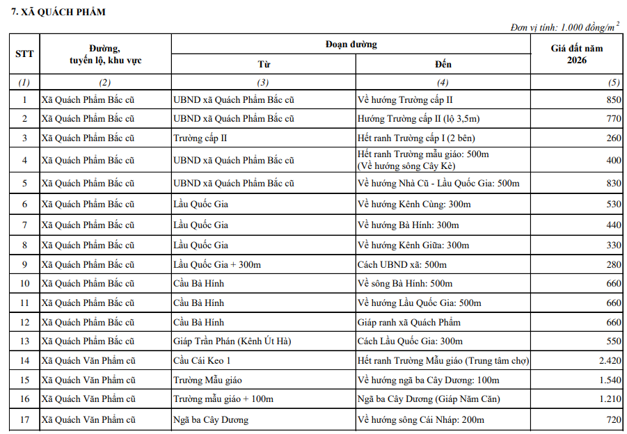 Bảng giá đất Cà Mau mới nhất 2026 được quy định chi tiết tại Mục lục ban hành kèm theo Nghị quyết 16/2025/NQ-HĐND tỉnh Cà Mau. Trong đó, bảng giá đất xã Quách Phẩm Cà Mau mới nhất 2026 được quy định cụ thể tại tiểu mục 7 Mục II quy định tại Mục lục ban hành kèm theo Nghị quyết 16/2025/NQ-HĐND tỉnh Cà Mau như sau: