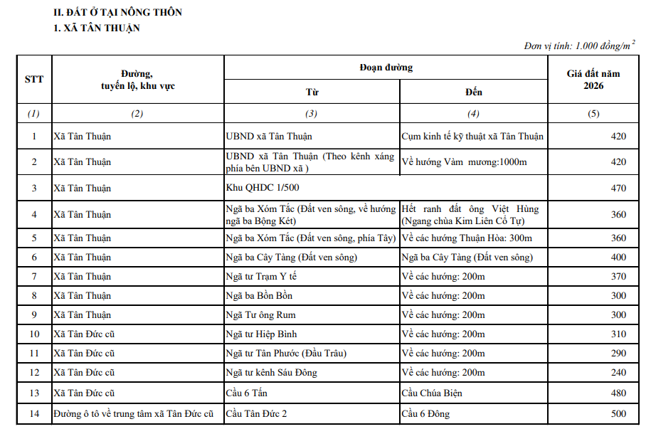 Trong đó, bảng giá đất xã Tân Thuận Cà Mau 2026 được quy định như sau: