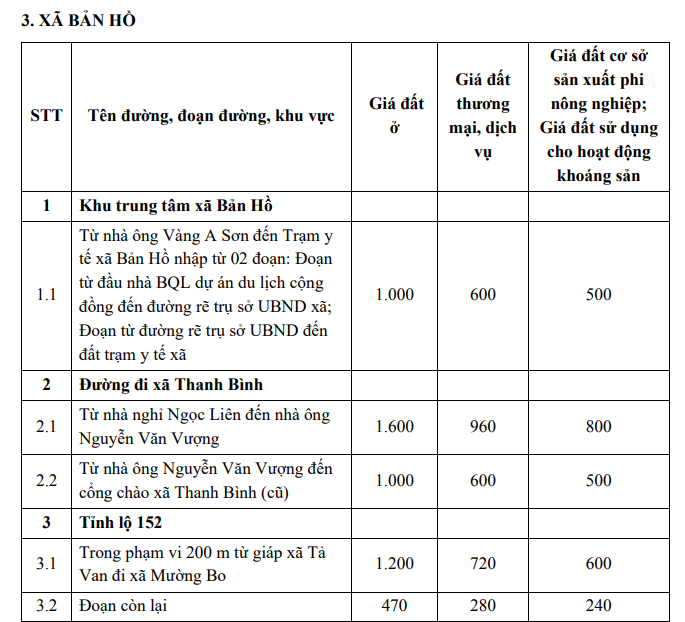 Tra cứu bảng giá đất xã Bản Hồ tỉnh Lào Cai 2026