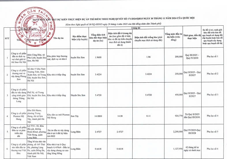 Theo đó, tại Điều 1 Nghị quyết 30/NQ-HĐND năm 2025 thành phố Hà Nội đã thông qua Danh mục khu đất dự kiến thực hiện dự án thí điểm trên địa bàn thành phố Hà Nội theo Nghị quyết 171/2024/QH15 như sau: