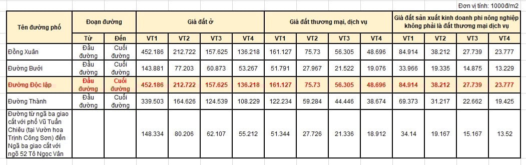 Bảng giá đất đường Độc Lập quận Ba Đình cũ Hà Nội 2026