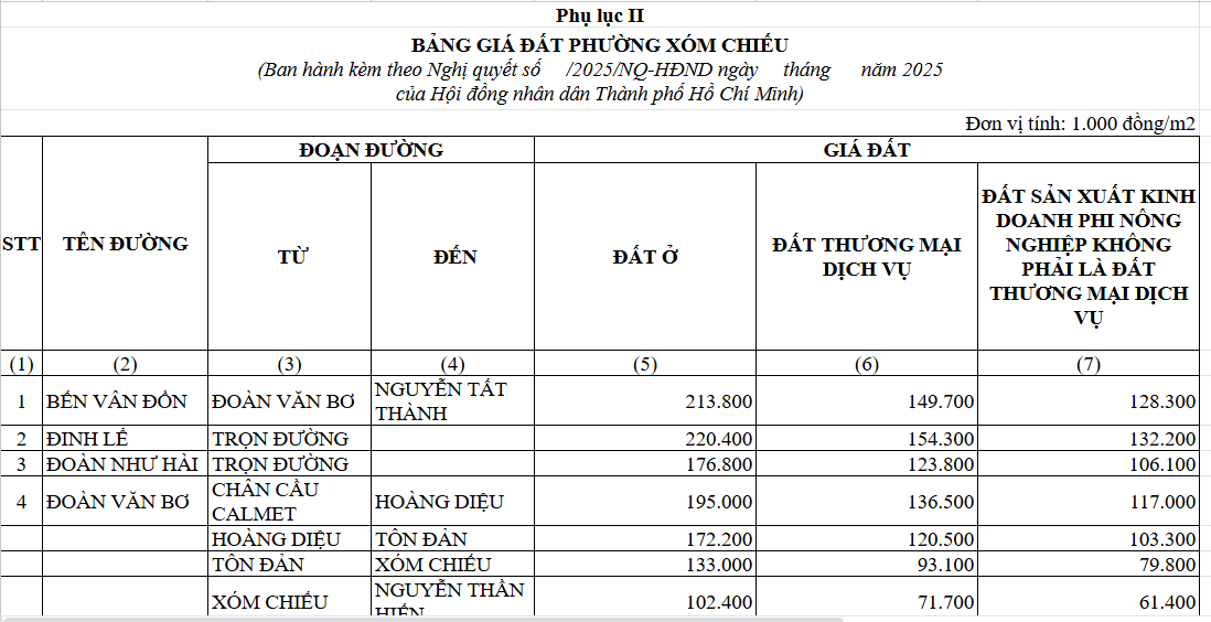 Đây cũng là mức giá cao nhất trong toàn bộ bảng giá đất phường Xóm Chiếu đối với cả đất ở, đất thương mại - dịch vụ và đất sản xuất, kinh doanh phi nông nghiệp