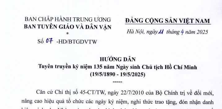 Ngày 11/4/2025, Ban Tuyên giáo và Dân vận Trung ương ban hành Hướng dẫn 07-HD/BTGDVTW Tuyên truyền kỷ niệm 135 năm Ngày sinh Chủ tịch Hồ Chí Minh (19/5/1890-19/5/2025).