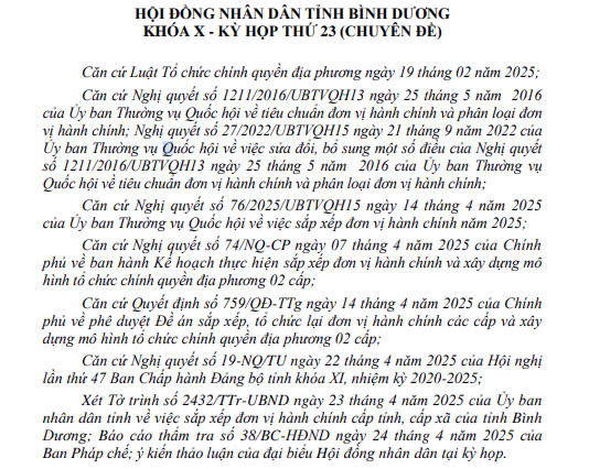 Ngày 24/4/2025, HĐND tỉnh Bình Dương có Nghị quyết 33/NQ-HĐND năm 2025 về việc cho ý kiến chủ trương sắp xếp đơn vị hành chính cấp xã của tỉnh Bình Dương.