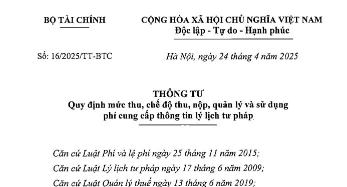 Ngày 24/4/2025 Bộ Tài chính ban hành Thông tư 16/2025/TT-BTC quy định mức thu, chế độ thu, nộp, quản lý và sử dụng phí cung cấp thông tin lý lịch tư pháp.