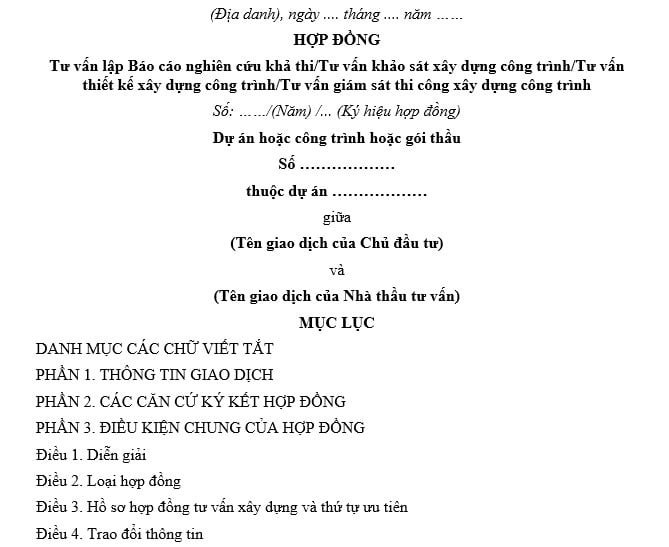 - Mẫu hợp đồng tư vấn xây dựng trên là để các tổ chức, cá nhân tham khảo, vận dụng trong việc xác lập, quản lý thực hiện hợp đồng cho các gói thầu xây dựng, đảm bảo nội dung hợp đồng xây dựng theo quy định tại khoản 1 Điều 141 Luật Xây dựng 2014